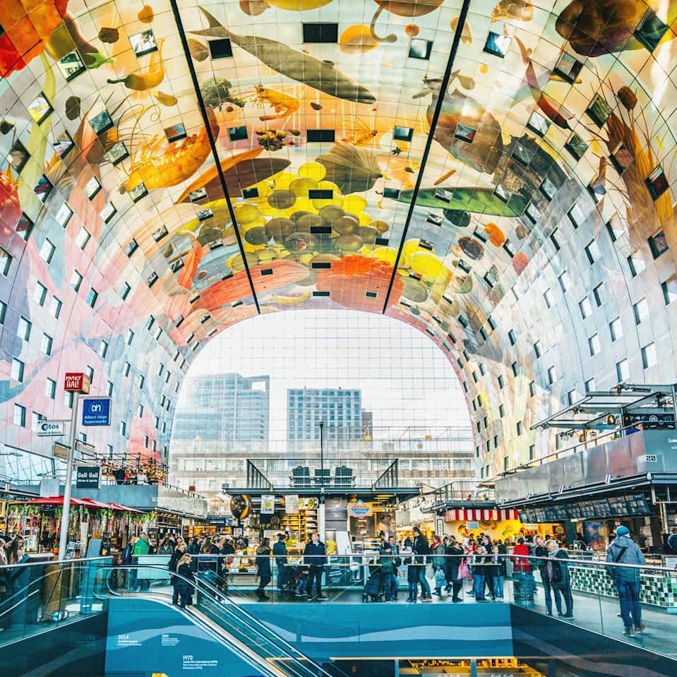 側面の壁と天井部分には巨大なアートが描かれており、美しい絵画に囲まれたような状態で買い物を楽しむことができます。外観のユニークさ、中のカラフルさから、大変フォトジェニックなスポットとして、ロッテルダムを訪れる多くの人が写真を撮りに訪れています。